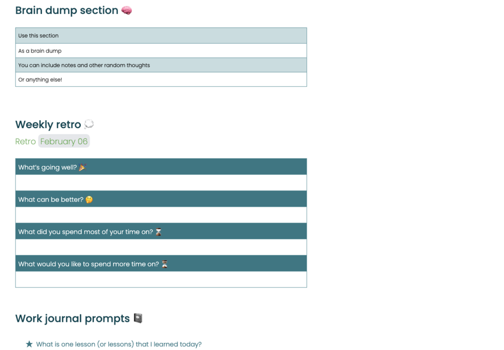 - a weekly retro section with four prompts: what is going well? what can be better? what did you spend most of your time on? what would you like to spend more time on?